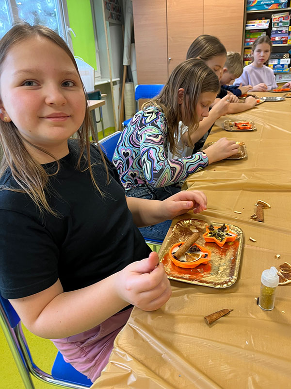 W czasie pracy w całej sali unosił się cudowny aromat świątecznych olejków – cynamonu, pomarańczy i wanilii. Uczniowie z ogromnym zaangażowaniem dobierali barwy, dekoracje oraz zapachy, dzięki czemu każda bombka była niepowtarzalna i pełna świątecznego klimatu.