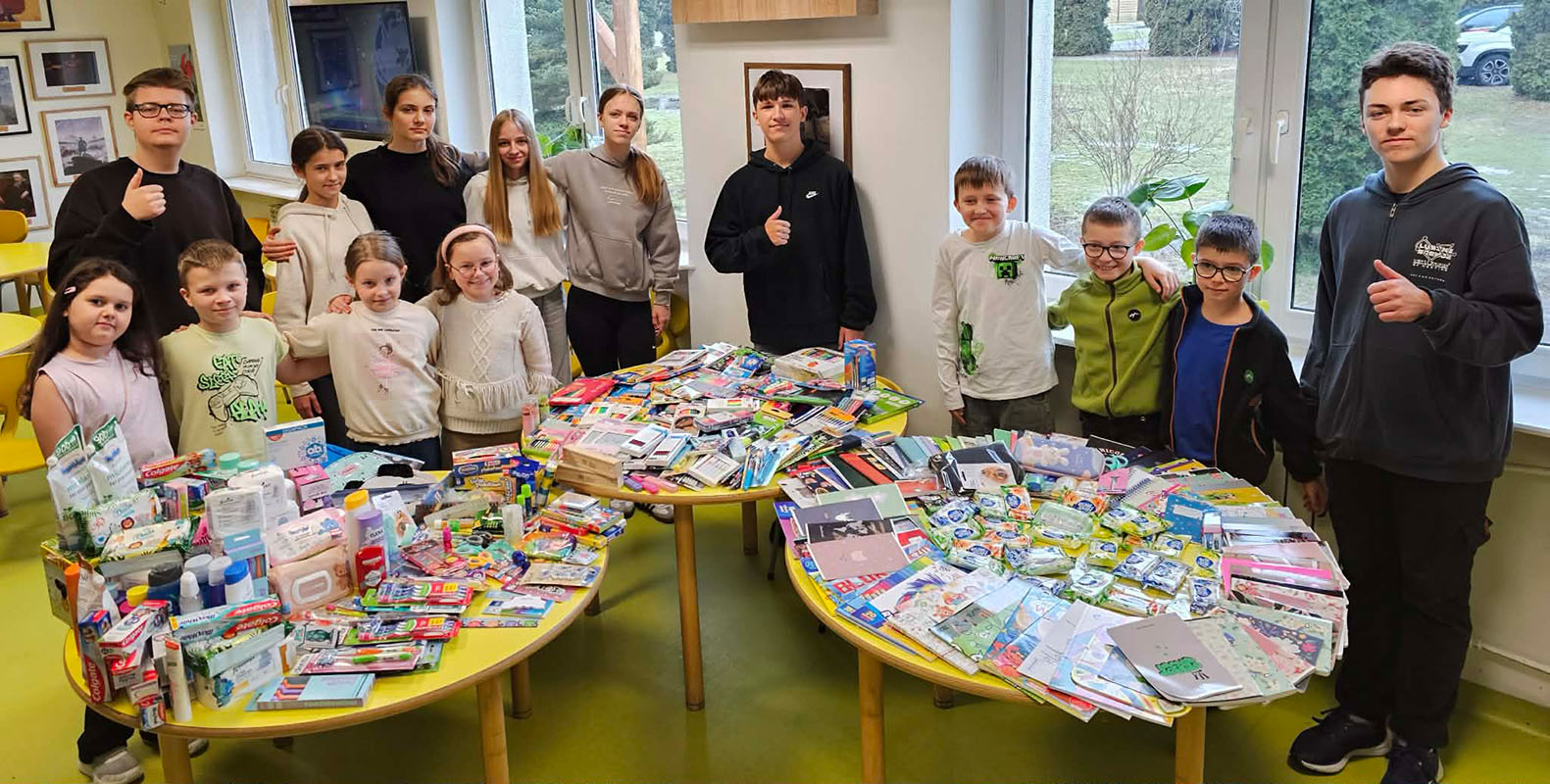 W ramach zbiórki zgromadziliśmy nowe, nieużywane przybory szkolne, takie jak: długopisy, kredki, zeszyty, bloki rysunkowe, mazaki, teczki, plecaki, ołówki, gumki do ścierania oraz wszystko to, co może przydać się uczniowi w codziennej nauce jak i podstawowe artykuły higieny osobistej.